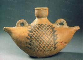 该器器做船型,杯型口,平肩,肩上两边各无一半环型钮,鼓腹,两头起尖角,平底。泥量红陶胎,器身概况不甚平顺,抚摩时无涩手感。腹两壁以赭黑彩绘网纹。