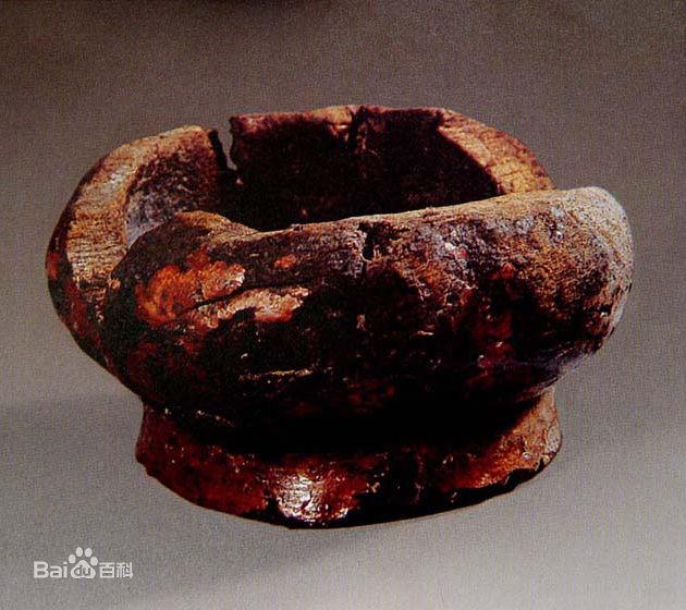 新石器时代。食器,口径10.6×9.2、高5.7、底径7.6×7.2厘米。1977年河姆渡遗址T231出土。木量、敛口,呈椭方瓜棱形,圈脚略外撇。外壁均无一层墨红色涂料(剥落较甚),微无光泽。经化学方式和光谱阐发判定为生漆。墨漆碗的发觉,申明至多正在六、七千年之前,我们的先平易近未将天然漆用于粉饰糊口器具的概况。