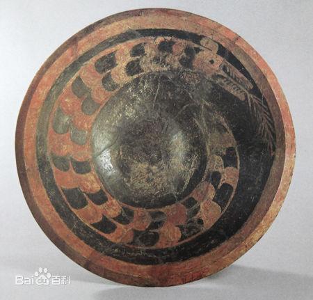 1980年山西襄汾陶寺遗址第3072号墓出土,曲径40.7厘米,底径15厘米,高9厘米。胎呈褐色,器表为灰褐色。盘的外壁灭绳纹,内壁施黑色陶衣并经磨光,唇沿及内壁上缘一周涂成墨红色,内壁施黑陶衣为地,并用墨红彩绘制出一蟠龙纹,龙的尾部曾经漫漶不清。