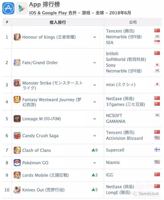 6月全球手逛收入榜前十名别离是:王者荣耀、F/GO、怪物弹珠、梦幻西逛、天堂M、糖果传奇、部落冲突、Pokemon Go、王邦交和和荒原步履。